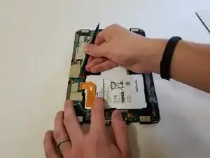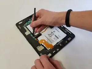 Используйте плоский конец лопатки , чтобы отщёлкнуть разъём между аккумулятором и материнской платой.