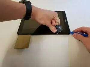 Продвигаясь вдоль края с помощью инструмента для вскрытия, используйте пластиковую карту , чтобы удерживать стекло отдельно от средней рамки.
