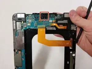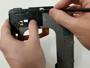 Переверните материнскую плату и найдите ленточный кабель, присоединяющий заднюю камеру к плате. Аккуратно отщёлкните ленточный кабель от платы плоским концом лопатки.