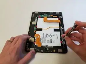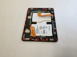 Отверткой Phillips #000 выкрутите пять винтов, фиксирующих аккумулятор, и двадцать два винта, окружающих среднюю рамку.