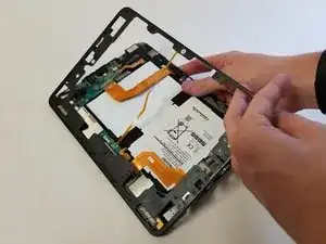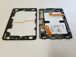 Переверните среднюю рамку и извлеките аккумулятор, убедившись, что вы выдвигаете его из-под ленточных кабелей.