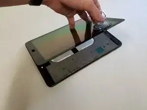 Нажмите на присоску, чтобы создать герметичное прилегание, и потяните вверх с усилием, чтобы отделить дисплей от средней рамки.