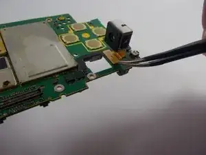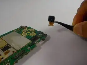 Используйте пинцет, чтобы снять камеру с материнской платы. Держите за пластиковый разъём и прикладывайте усилие от платы.