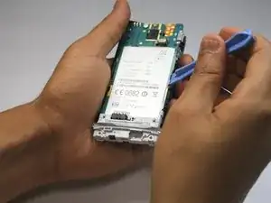 Откройте заднюю часть устройства, поддевая по сторонам заднюю панель пластиковым инструментом для открытия.