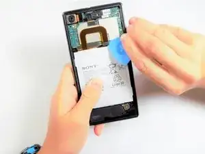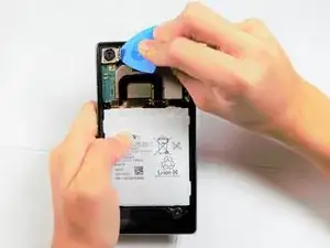 Используйте медиатор для вскрытия, чтобы отщёлкнуть шлейф батареи.