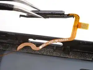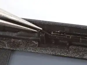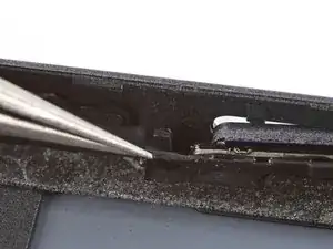 Пинцетом аккуратно захватите верхнюю резиновую лапку кнопки питания и поднимите её из паза.