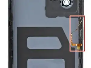 Поднимите заднюю крышку с рамки и переверните её через левую кромку телефона, уложив крышку на рабочую поверхность.