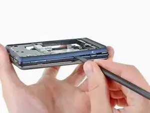 Осторожно вставьте лопатку между задней и передней частями корпуса в верхней части телефона, рядом с аудиоразъёмом.