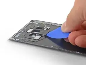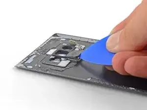 Используя вставленную лопатку, аккуратно разрежьте клей вокруг верхнего левого угла задней панели.
