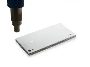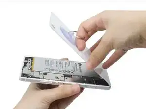 Установите присоску и потяните, чтобы открыть зазор между задней крышкой и корпусом. Затем вставьте медиатор и проведите, чтобы отрезать наклейку.