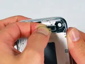 Отведите плату с кнопками громкости от боковой части iPhone и аккуратно отлейте оранжевый ленточный кабель от задней панели корпуса. Кабель тонкий и легко повреждается.