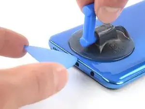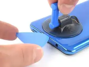 Если вам не удаётся попасть между задней панелью и средним каркасом с помощью инструмента, можно использовать присоску или прочную ленту, чтобы приподнять заднюю панель и создать зазор.