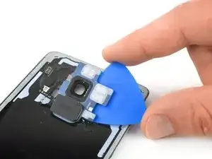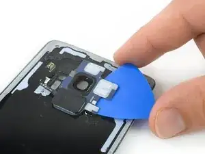 Поверните медиатор вбок, чтобы поддеть рамку задней камеры вместе с датчиком отпечатка пальца.