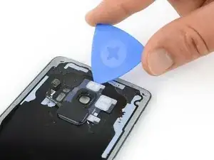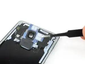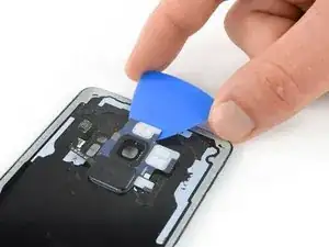 Используйте это руководство, чтобы снять заднюю рамку камеры вместе с датчиком отпечатка пальца в Samsung Galaxy S9.