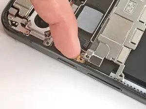 Используйте острие лопатки, чтобы надавить на защёлку кронштейна фронтальной камеры внутрь и вверх, чтобы освободить её.