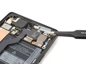 Используйте пинцет, чтобы отогнуть серебряную ленту, соединяющую среднюю рамку и верхний динамик.