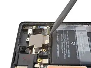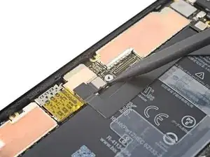 Вставьте кончик медиатора для вскрытия под нижний правый край прижимного разъёма кабеля дисплея, прямо над ближайшим отверстием для винта.