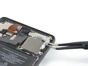 Используйте пару пинцетов, чтобы осторожно снять верхнюю графитовую пленку с батареи и средней рамки.