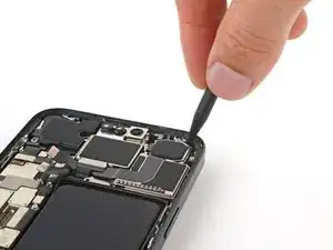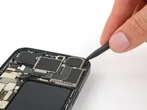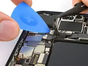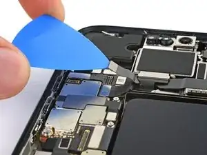 Используйте кончик медиатора, чтобы приподнять и отключить три защёлки задних камер в верхнем правом углу логической платы.