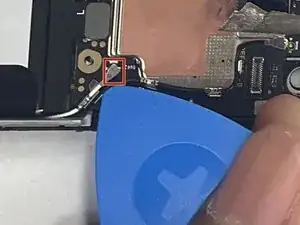 Подложите лопаточку или инструмент под край разъёма и подденьте прямо вверх, чтобы отсоединить разъём кабеля сканера отпечатков.