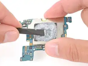 Используйте плоский конец лопатки, чтобы приподнять верхний край платы логики, пока вы не сможете схватить её края пальцами.