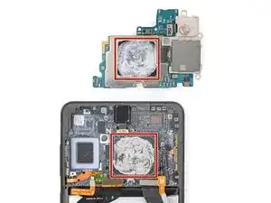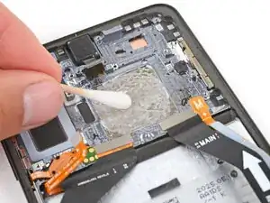 Термопаста лежит на хрупких поверхностях — тонкой плёнке на плате логики и паровой камере в раме. Работайте осторожно с минимальным давлением и не беспокойтесь, если не удастся удалить каждое её остатка.