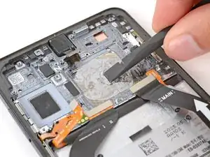 Используйте острый конец лопатки, чтобы поддеть и отключить прижимные разъёмы антенны 5G mmWave и передней камеры.