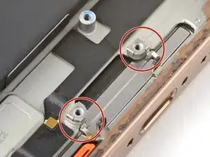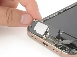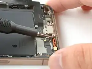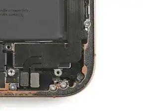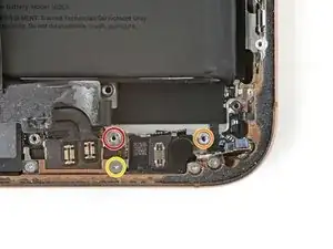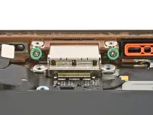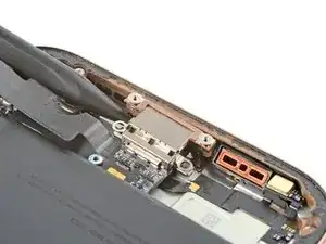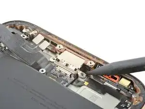 С помощью отвёртки P2 с пенталобовидным наконечником отвинтите два винта длиной 7,4 мм по обе стороны от зарядного порта.