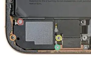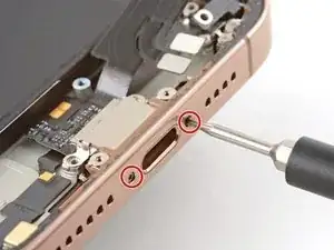 Используйте отвертку P2 pentalobe, чтобы установить два винта длиной 7,4 мм по обе стороны от разъёма зарядки.