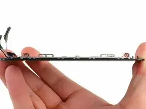 При повторной сборке защёлкните левые крючки под логической платой и опустите скобу в сторону наружной части телефона.