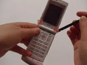 С помощью плоского конца лопатки удалите пластиковые накладки, расположенные на углах дисплея рядом с петлей и над экраном, открывая доступ к четырем винтам под ними.