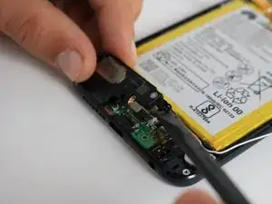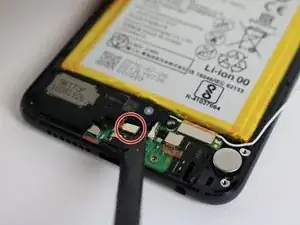С помощью лопатки отщёлкните небольшой разъём между динамиком и корпусом телефона, расположенный ближе к нижней части устройства, обведённый красным.