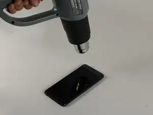 Используя тепловую пушку или фен, направьте тепло примерно в трех дюймах над стеклянной панелью, чтобы разогреть клей по внешнему краю телефона.