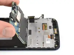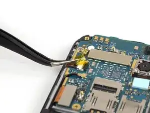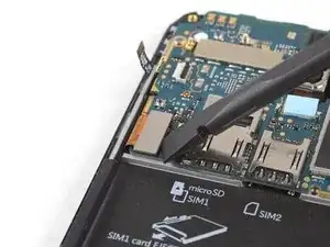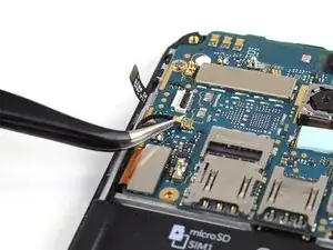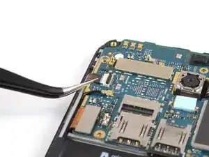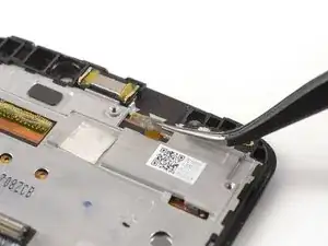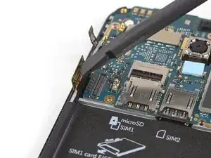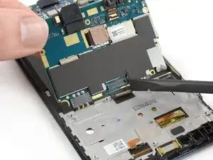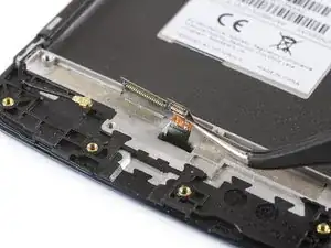 Воспользуйтесь пинцетом, чтобы отсоединить оба гибких кабеля дисплея от корпуса. Они расположены в нижнем левом углу и в верхней части материнской платы.