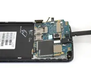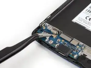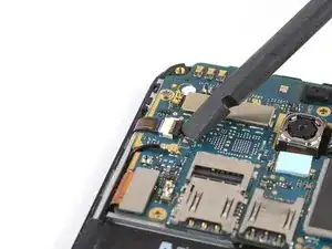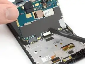 Используйте край лопатки, чтобы аккуратно поддеть и отключить шлейф дисплея, расположенный в нижнем левом углу материнской платы.