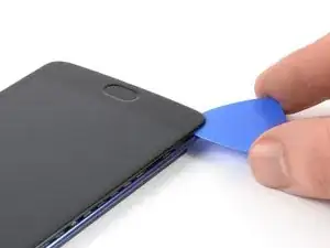 Проведите лопаткой от верхнего правого угла вдоль бокового края телефона, чтобы разрезать клей.