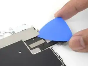 Используйте медиатор, чтобы разрушить клей возле кнопки "Домой", удерживающий плоский кабель дисплея к защитной пластине LCD.