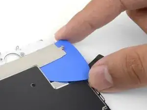 Вставьте медиатор с нижнего правого угла и продолжайте отделять кабель дисплея от защитной пластины LCD.
