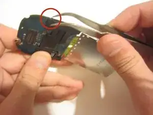 Снимите пластиковую деталь с платы, разблокировав переключатель на пластиковой части с помощью пинцета.
