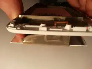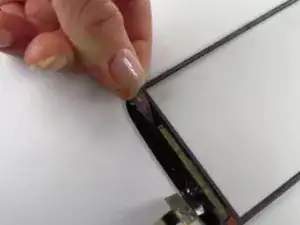 Протолкните ленточный кабель, подключенный к цифротрансформатору, через отверстие в корпусе, затем оттяните стеклянный экран от телефона.