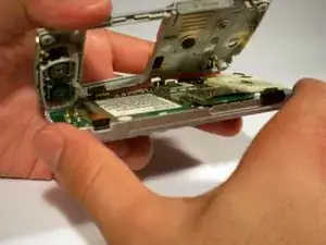 Извлеките камеру с прилегающей микросхемой с помощью инструмента для извлечения (iPod removal tool). Аккуратно подденьте микросхему в месте её соединения — вместе с ней выйдет и камера.