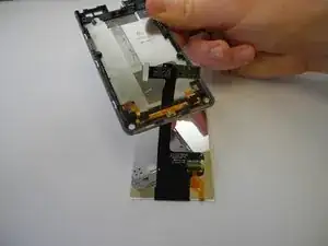 Последний шаг — извлечение ЖК-экрана из корпуса. Начните с аккуратного отклеивания ленточного кабеля с внутренней стороны корпуса.