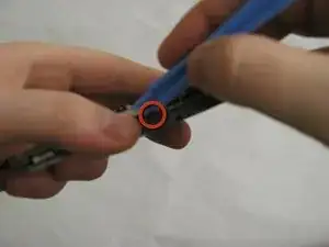Используйте медиатор или другой небольшой инструмент, чтобы отщелкнуть маленькую пластиковую защёлку, удерживающую ЖК-панель.