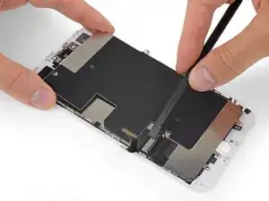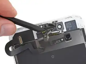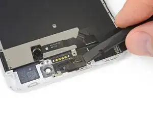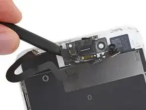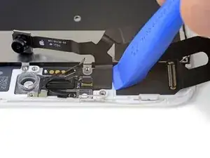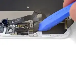 Вставьте острую кромку инструмента iFixit под гибкий кабель блока камеры, с противоположной стороны от фронтальной камеры.