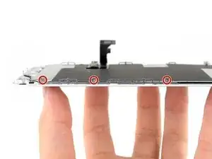 С помощью отвёртки Y000 отвинтите три винта 1,2 мм с одной стороны экранирующей пластины дисплея.
