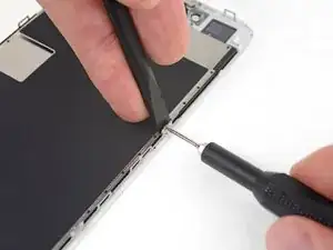 Герметизирующий клей, удерживающий дисплей, очень прочен; для создания начального зазора требуется значительная сила. Если у Вас не получается открыть зазор, примените больше тепла и осторожно покачивайте экран вверх-вниз, чтобы ослабить клей, пока не появится достаточно зазора для вставки инструмента.