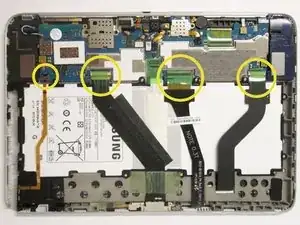 Осторожно отсоедините все шлейфы, которые проходят над аккумулятором, из мест, отмеченных жёлтыми кругами.