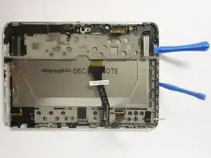 Используйте два пластиковых инструмента, один для поддержки, другой для поддёма, чтобы полностью отделить корпус ЖК-экрана от рамки дигитайзера.