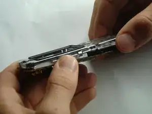 Ослабьте серую защёлку, удерживающую шлейф ЖК-экрана: подденьте одну сторону защёлки пластиковым инструментом, затем аккуратно отсоедините другую сторону от держателя.
