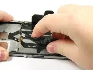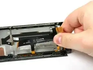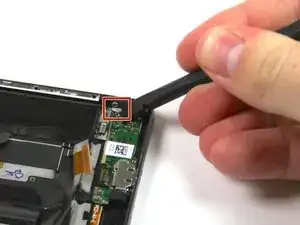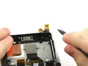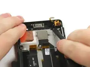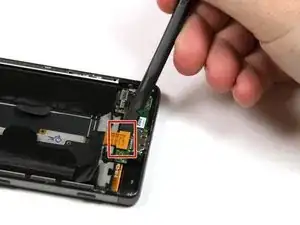 Лопаткой подденьте оранжевый разъём, находящийся прямо под местом, где был снят динамик.